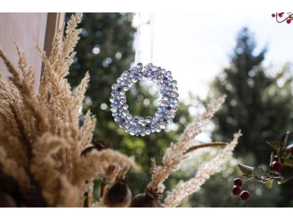 Ověsy vyrábíme z broušených skleněných korálků z křišťálového skla a kovových komponentů. Vše je zavěšeno na tenkém lanku. Celkové délka jednoho ověsu je 14 cm. Při objednání tohoto produktu dostanete celkem pět kusů originálních ozdob doplněné krátkou básničkou od autorky Baluk.