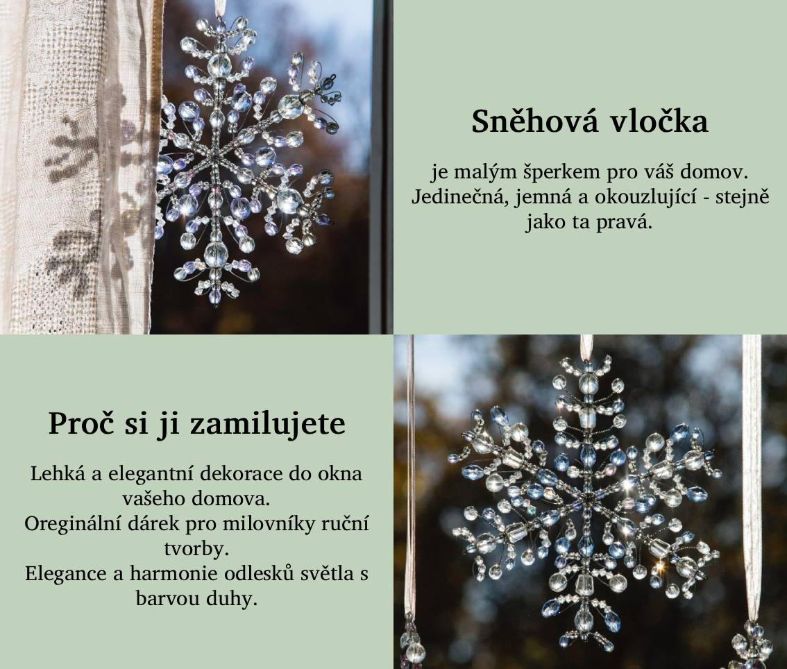 Sněhové vločky vyrábíme z broušených skleněných korálků z křišťálového skla, nerezového drátku a kovových komponentů. Průměr sněhové vločky je 14 cm. Při objednání tohoto produktu dostanete jednu sněhovou vločku, stužku na zavěšení a kartičku s krátkou básničkou od autorky Baluk.
